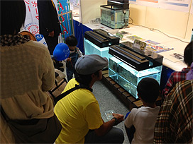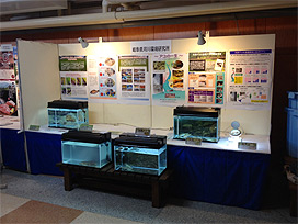 当日は、フナやメダカを懐かしがられる方や、アユ仔魚の小ささに驚かれる方もおられ、アユについて多くのご質問や貴重なご意見を受けることもあり、来場者の皆様には研究内容にも関心をもっていただけたと感じております。