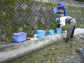2 ヶ所の渓流で調査し、アマゴとイワナの生息を確認しました。