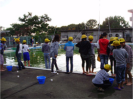 今回の学習会は、魚をとるための方法を学んだり、体験したりするものです。最初に、研究所の職員が河川漁業や魚の生態などの講演を行い、引続いて学校のプールを利用して釣り体験が行われました。みんな楽しそうに釣りをしていました。