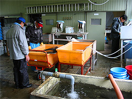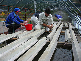 検卵が終わった発眼卵は、養殖業者に順次発送しています。また、一部の発眼卵を次の親魚養成用として下呂支所に残し、ふ化室に収容しています。