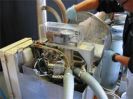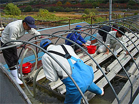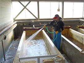ふ化室は、アマゴやヤマメなどの稚魚の餌付けを行う施設です。稚魚は病気に弱いため、収容前に施設内の清掃や器材の消毒を行っています。