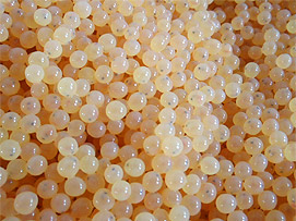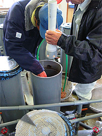 「検卵」 と呼ばれ、卵の出荷やふ化室への移送の前に必ず行っています。検卵が終了した発眼卵は、養殖業者への出荷や当研究所での継代飼育などに使用しています。