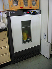 当研究所では、目的に応じて、5℃・10℃・15℃・20℃にそれぞれ温度設定して使っています。写真のインキュベータは、20℃に設定してあり、せっそう病菌