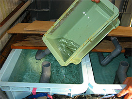 カジカは、ふ化から 1 ヶ月半ほどの間は人工海水の中で飼育します。採卵作業