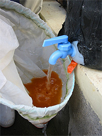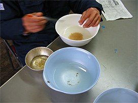 受精前の洗卵作業 (等張液で卵を洗浄)