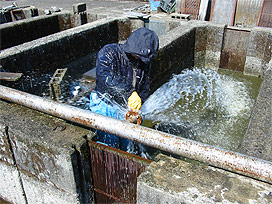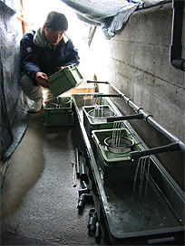 今年も採卵の時期が近づいてきたため、器材や水槽の準備を始めました。水槽には、人が上に乗ってもびくともしないほどのぶ厚い氷が張っており、苦労してつるはしで割って氷を除去しました。