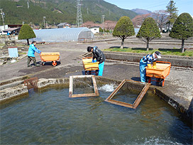 10 枚程度重ねた状態で上下を針金で固定し、ふ化水槽の中に設置します。ふ化水槽では、井戸水を流してふ化盆の中で発眼卵をふ化させた後、仔魚期の終わりまで収容しています。