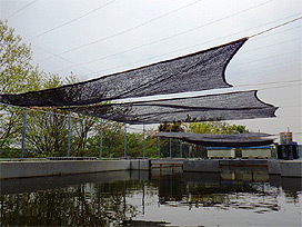 野外池は本所施設南側の非常に日当たりのよい場所に設置されています。昨年は日除けシートをつけずにいたら、写真のように池全面にアオミドロ等の糸状藻類が大繁殖し、藻類の除去に大変な労力がかかりました。