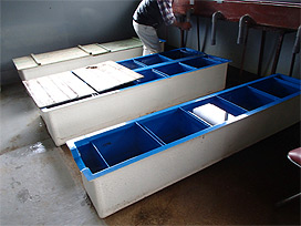 ふ化室では、まず 「ふ化盆 (ふかぼん)」