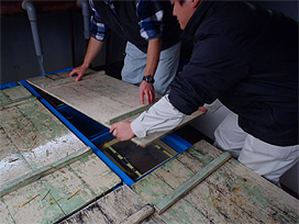 これらの作業は 「検卵」 と呼ばれ、卵の出荷やふ化室への移送の前に必ず行っています。検卵が終了した発眼卵は、養殖業者への出荷や当研究所での継代飼育などに使用しています。