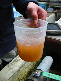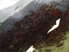 カジカは、ふ化から 1 ヶ月半ほどの間は人工海水の中で飼育します。採卵作業