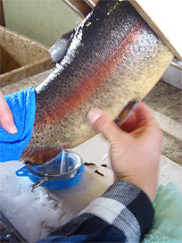 雌親魚からの採卵作業