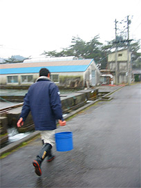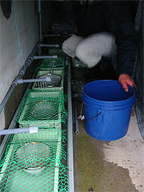 井戸水を流しながら、餌付け直前まで収容