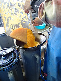 卵管理水槽からの発眼卵の取り出し作業