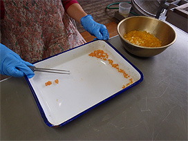 目視観察と手作業による検卵には、時間だけでなく根気が必要です。連日、職員が辛抱強く検卵作業を続けています。