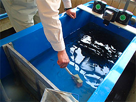 「池出し」 と呼んでいます。餌付けのタイミングが遅れると稚魚の生残率が悪化するおそれがあるため、水温や稚魚の成育状況を勘案して池出しの時期を調整しています。