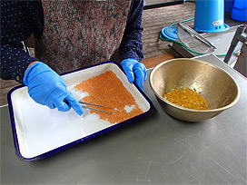 卵は、受精後しばらく安静が必要ですが、発眼卵の段階になると外部からの衝撃に比較的強くなり、収容水槽から取り出すことができるので、検卵機により生卵と死卵とを分別する作業が可能になります。死卵を放置すると、水カビ発生の原因となるので取り除かなければなりません。ただし、検卵機による除去では、少数の死卵が残るため、残った死卵を目視観察と手作業で取り除く必要があります。