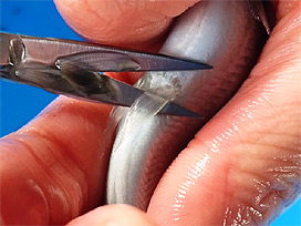 標識作業は、薄い麻酔薬によりアユの動きを緩慢にした後、外科用ハサミを用いてひれを切除します。切除部位によりひれが再生してしまうため、しっかりと基部から切除する必要があります。切除した脂びれはほとんど再生しませんが、腹びれは適切に切除しないと、再生してきてしまうため注意が必要です。