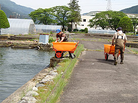 下呂支所では、主に屋外の飼育池でアマゴやニジマスなどを飼育しています。魚が混みあっている飼育池では病気が発生しやすくなるので、個体数や体サイズに応じて、より大きい池に魚を移し替えるか、いくつかの池に分けて飼育するようにしています。
