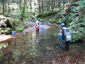 渓流で魚類調査を行いました。今日の調査では、アマゴ・タカハヤ・アジメドジョウ・アカザ・カワヨシノボリ・カジカ大卵型の生息を確認しました。