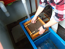 ふ化水槽から ふ化盆を取り出す