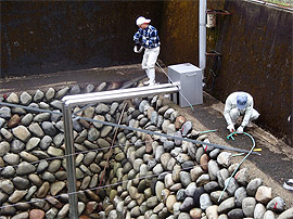 (益田川) の増水時に濁った水が流入すると飼育池の底に泥が堆積するので、その都度、掃除しなければなりません。使用していない池でも藻が生えたり落ち葉がたまったりするので、使用を再開する前に掃除するようにしています。