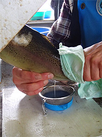 下呂支所で今年 4 回目のニジマスの採卵と人工受精を行いました。