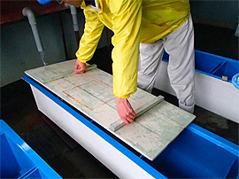 10 枚程度重ねた状態で上下をひもで固定し、ふ化水槽の中に設置します。