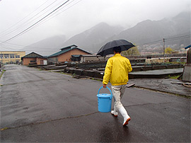 魚を飼育している池では、残餌や排泄物の掃除が必要です。また、水源の飛騨川