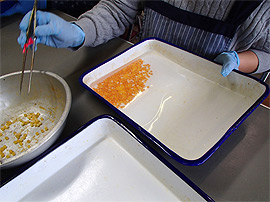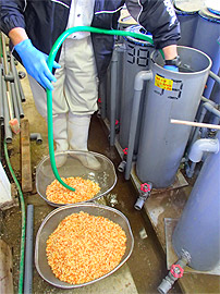 これらの作業は 「検卵」 と呼ばれ、卵の出荷やふ化室への移送の前に必ず行っています。検卵が終了した発眼卵は、養殖業者への出荷や当研究所での継代飼育などに使用しています。