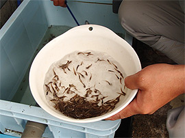 ふ化水槽では、井戸水を流してふ化盆の中で発眼卵をふ化させた後、仔魚期の終わりまで収容しています。