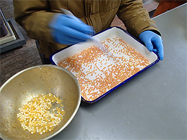 死卵 (左側のざる) と 生卵 (右側のざる)