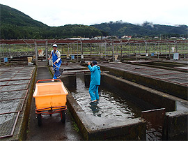 雌親魚の選別作業