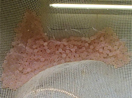 個ずつに小分けして入れます。ふ化盆はいくつか重ねた状態で上下をひもで固定し、ふ化水槽の中に設置します。ふ化水槽では、ふ化盆の中で発眼卵をふ化させた後、仔魚期の終わりまで収容しています。
