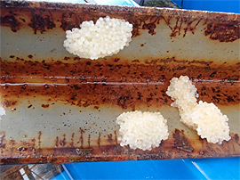 回収した卵は、卵管理用の水槽に移して管理しています。この後、発生が進んだ卵から、検卵作業