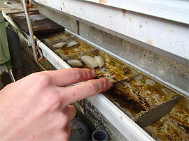 (益田川) の増水時に濁った水が流入すると飼育池の底に泥が堆積するので、その都度、掃除しなければなりません。使用していない池でも藻が生えたり落ち葉がたまったりするので、使用を再開する前に掃除するようにしています。
