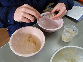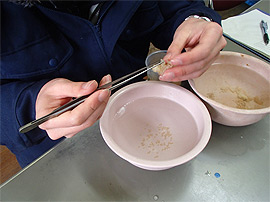 検卵作業では、卵塊をほぐしながら、死んだ卵をピンセットで取り除いていきます。根気がいりますが、カジカの養殖では非常に大事な作業です。検卵完了後の発眼卵は、ふ化用の水槽に入れて管理しています。