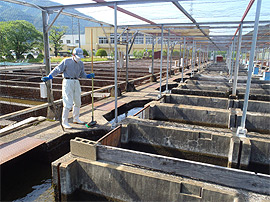 (益田川) の増水時に濁った水が流入すると飼育池の底に泥が堆積するので、その都度、掃除しなければなりません。使用していない池でも藻が生えたり落ち葉がたまったりするので、使用を再開する前に掃除するようにしています。
