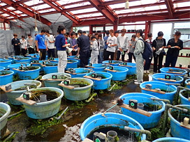 「池出し」 と呼んでいます。餌付けのタイミングが遅れると稚魚の生残率が低下するおそれがあるため、水温や稚魚の成育状況を勘案して池出しの時期を調整しています。