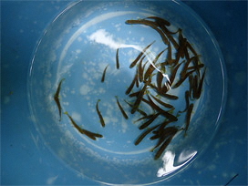 両側回遊性のカジカの仔魚は、冬にふ化してすぐに川を流下して海で生活していますが、春に稚魚に変態した後、川に遡上してきます。下呂支所では、仔魚は人工海水