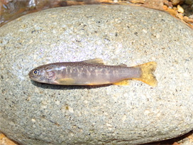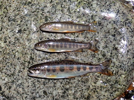 今日の調査でも、イワナとヤマメの生息が確認されました。また、イワナとヤマメの交雑と考えられる個体も確認されました。