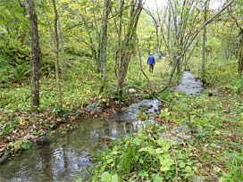 22 日に人工産卵場を造成した渓流で産卵状況を調査しました。