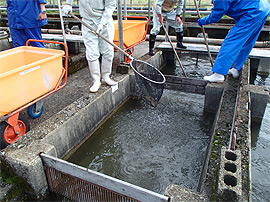 (益田川) の増水時に濁った水が流入すると飼育池の底に泥が堆積するので、その都度、掃除しなければなりません。使用していない池でも藻が生えたり落ち葉がたまったりするので、使用を再開する前に掃除するようにしています。