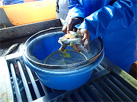 1 個体ずつ触診して、採卵可能な個体を選び出す