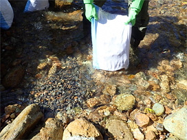郡上市白鳥町石徹白にある渓流魚人工産卵河川で産卵状況を調査しました