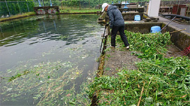 下呂支所では、主に屋外の飼育池でアマゴやニジマスなどを飼育しています。魚が混みあっている飼育池では病気が発生しやすくなるので、個体数や体サイズに応じて、より大きい池に魚を移し替えるか、いくつかの池に分けて飼育するようにしています。