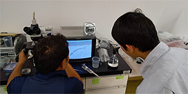 当所の職員が補助や解説しながら、水を顕微鏡で観察して、どのような生き物がいるか調べていました。 |