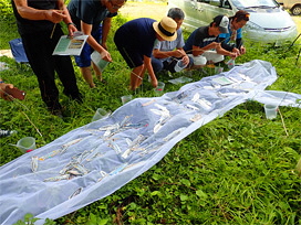 連日の猛暑の中、生態環境部では今週も水田排水路の魚類調査を行っています。