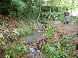 渓流魚の人工産卵河川は、野生個体の自然繁殖を助けるため、水がないところに