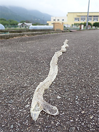 下呂支所の飼育池でヘビの抜け殻が見つかりました。昨日、近くにいたアオダイショウがここで脱皮したようです。